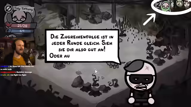 03:09:56Der Streamer erkundet die Interaktion der Fähigkeiten seiner Katzen. Er entdeckt, dass die Kombination von "Heißblütig" und "Sonnenbrand" besonders effektiv ist, da Verbrennungen verstärkt werden. Nachdem er neue Gegenstände wie Katzenminze und einen Stock gefunden hat, bereitet er sich auf einen Bosskampf vor. Er beschreibt den Bosskampf gegen den "pebbles", betont die Wichtigkeit der Zugreihenfolge und beginnt den Kampf.