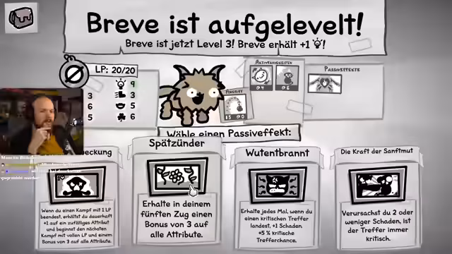 03:17:46Im Kampf gegen einen Gegner werden die Katzen strategisch eingesetzt. Nachdem der Gegner auf 6 Leben reduziert wurde, wird der Sieg gesichert. Anschließend wird über die Wahl einer Passivfähigkeit diskutiert. Die Option 'Senkai-Erweckung', die ein zufälliges Attribut erhöht, wenn ein Kampf mit 1 HP überlebt wird, wird als sehr situativ eingestuft. Letztlich wird die Fähigkeit 'Spätsünder' gewählt, die im fünften Zug einen Bonus auf alle Attribute gewährt, was für längere Kämpfe als nützlich erachtet wird.