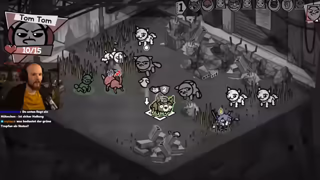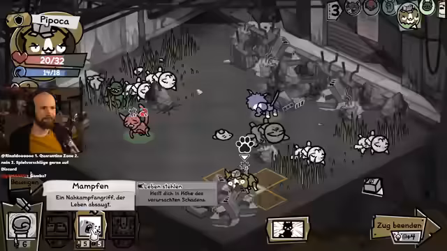 04:04:10Nach einem Kampf stirbt eine Katze, doch ein neuer Streuner, 'Captain Tim', schließt sich dem Team an. Die neue Katze bringt die Fähigkeit 'verängstigt' mit, die den Schaden nach einem kritischen Treffer erhöht. Das Team durchläuft einen Kampf gegen einen 'Müllsack', der zufällige Gegenstände fallen lässt, und 'Pute', einen Vogel, der Attributebonusse gibt. Anschließend wird in einem Shop Ausrüstung wie ein 'Level' für eine Katze, eine 'Federmaske' zur Erhöhung der Ausweichchance und ein 'Schild' gekauft, um das Team zu stärken.