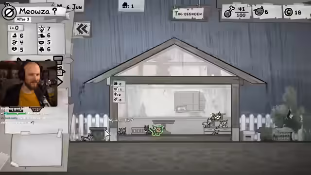 03:22:31Nach dem Kampf beginnen die Vorbereitungen für ein neues Abenteuer. Die Katze 'Brief' zeugt mit 'Tidy Tiffany' ein neues Kätzchen, das Merkmale beider Eltern erbt. Der Streamer nimmt einen weiteren Streuner namens 'Carrot' in seine auf, dessen Fähigkeit 'Russisch-Blau-Roulette' ihn mit einer 1 zu 6-Chance tötet, aber bei Überleben Attribute erhöht. Das Ziel ist, vier erwachsene Katzen für das bevorstehende Abenteuer zu sammeln, während die neugeborenen Kätzchen erst erwachsen werden müssen.