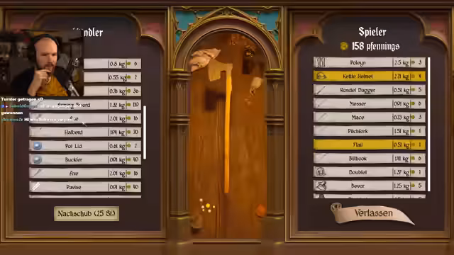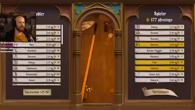 02:09:26Der Streamer erkundet den Handelsplatz und prüft verfügbare Rüstungen und Waffen. Er entscheidet sich gegen den Kauf einer teuren Hauberk für 100 und plant, stattdessen später eine bessere von Gegnern zu looten. Nach der Inspektion der angebotenen Gegenstände wie Handschuhe, Stöcke und Brustplatten, die allesamt nicht seinen Vorstellungen entsprechen, zieht er weiter, um Ottmar für den nächsten Kampf zu rüsten.