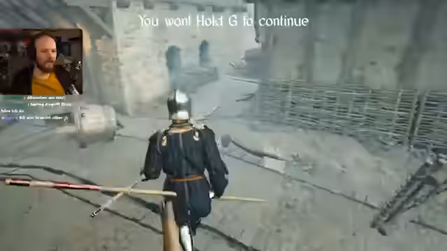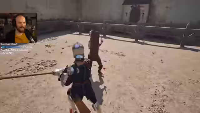 00:59:32Der Streamer wählt seinen Charakter Valentin aufgrund dessen starker Rüstung aus, um sie im Falle seines Todes selbst nutzen zu können. Beide steigen in einen Duellmodus ein und konzentrieren sich auf Präzision, um nicht zu fallen. Dabei wird erstmals eine neue Kampftechnik erprobt: Nach dem Hochhalten der Waffe und einem Handwechsel wird ein Schlag von oben ausgeführt. Diese Technik als besonders befriedigend und effektiv für Gegner mit Rüstung identifiziert, wird jedoch als schwierig zu treffen eingestuft.