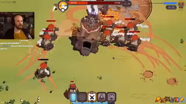 01:50:02Nach einer kurzen Pause wegen der Verletzung beginnt der Streamer mit einem neuen Spiel: Wanderburg. Er erklärt das Spielprinzip: Man steuert eine Burg, die umherfährt, Ressourcen einsammelt und sich wachsen lässt, um größere Burgen und Gegner zu besiegen. Er startet in der Rogue-Light-Variante und baut anfangs eine Besatzung aus Bogenschützen und seitlichen Kanonen auf, während er versucht, seine Burg am Leben zu halten und Münzen zu sammeln.