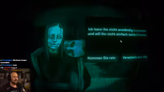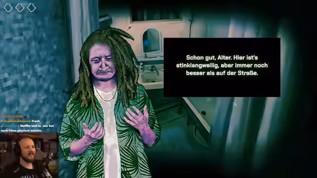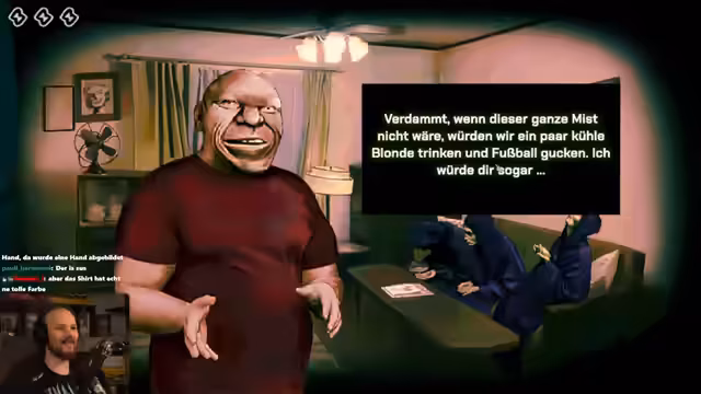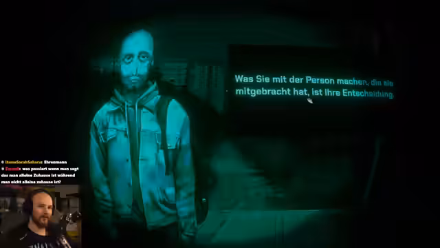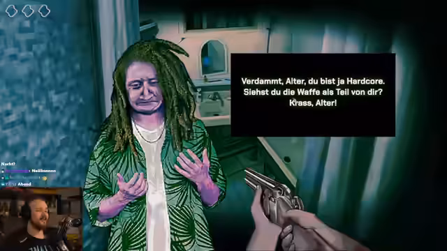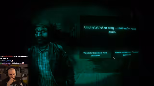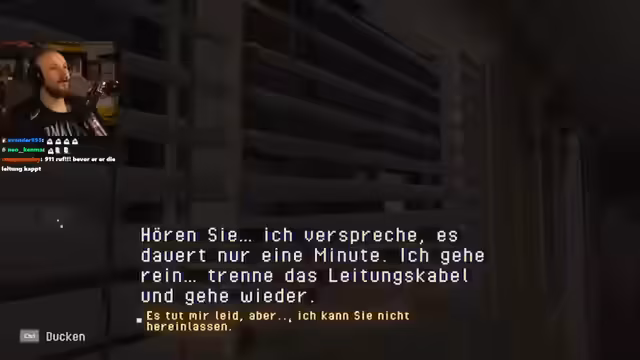 03:56:27Der Streamer befindet sich in einer angespannten Situation, als ein Grammophon unerwartet Musik spielt und ein unerwünschter Besucher auftaucht. Als Telefon und Taschenlampe versagen, muss er improvisieren, um sich vor der bedrohlichen Person zu verstecken. Die Szene ist geprägt von Desorientierung und Fluchtversuchen, bei denen die Türen mysteriös verriegelt bleiben. Die Nachbarin verschwindet plötzlich, und der Streamer ringt um einen Ausweg aus dem gefährlichen Haus, während er über die beste Versteckstrategie nachdenkt.