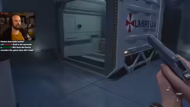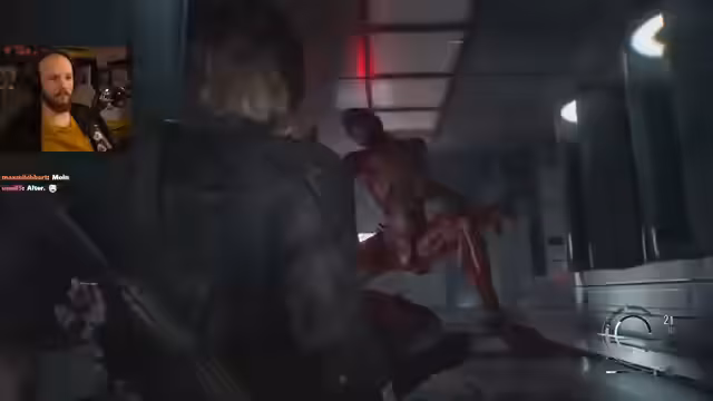 03:29:35Nach der gelungenen Runde wechselt der Streamer zum angekündigten Hauptthema des Abends: dem Finale von Resident Evil. Nach einem kurzen Dank an den Support und eine Unterbrechung zur Vorbereitung beginnt das Spiel im finalen Abschnitt des Labors. Der Streamer übernimmt die Kontrolle über die Figur Leon und macht sich sofort auf den Weg, während die erste große Bedrohung, ein schwer gepanzerter Gegner, auftaucht.