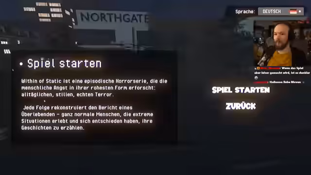 01:17:59Nach diversen Abschweifungen beginnt der Stream mit dem Indie-Horror-Spiel 'Within the Static: Northgate Mall'. Er startet eine neue Spielrunde, in der er die Rolle des Nachtwächters Dylan Miller übernimmt. Zunächst erkundet er die leer gefahrene Wachhütte, beantwortet eine Anruf von seinem Vorgesetzten Aaron und erhält die ersten Anweisungen für die Nachtschicht.