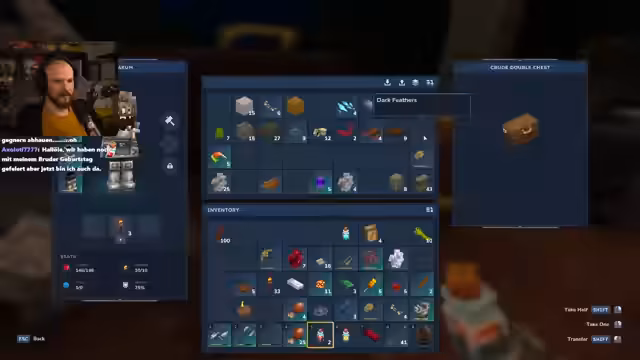 01:47:28Nachdem er sich in der Höhle verlaufen hat, gelingt es dem Streamer, an die Oberfläche zurückzukehren. Er muss jedoch feststellen, dass sein Lagerort nicht sofort wiederzufinden ist. Nachdem er sein Lager mit neu gewonnenen Ressourcen gefüllt hat, kehrt er dorthin zurück. Der Fokus verlagert sich nun auf die Weiterverarbeitung der Ressourcen. Er schmilzt Eisen ein und stellt eine Eisenrüstung und weitere Waffen wie eine Eisen-Battle-Axe und eine Dagger her, um seine Kampfkraft zu erhöhen.