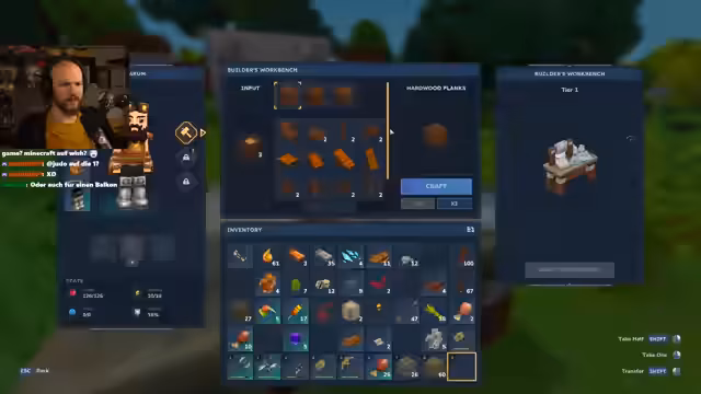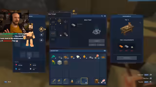 01:02:19Zu Beginn der Aufzeichnung etabliert der Streamer eine klare Strategie. Er plant zunächst die Herstellung von Standard-Ausrüstung, wie einer kleinen Rüstung und besseren Waffen, um seine Überlebenschancen zu erhöhen. Das Ziel ist es, mit dieser grundlegenden Ausrüstung die Welt zu erkunden, um einen geeigneten Ort für ein permanentes Lager zu finden und Ressourcen wie Eisen und Kupfer zu sammeln. Langfristig verfolgt er das Ziel, eine Rüstungswerkbank herzustellen, um bessere Rüstungen und fortschrittlichere Gegenstände craften zu können.