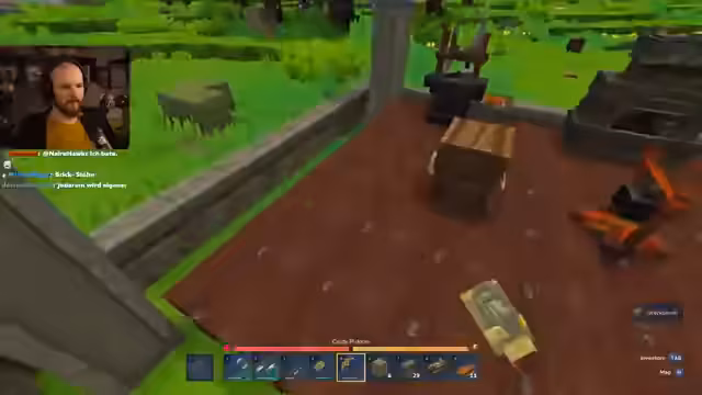 00:28:02Nachdem der Charakter erstellt wurde, startet der Streamer in die erste Hytale-Welt. Er ist von der Begeisterung überwältigt und sammelt initial Rohstoffe wie Stein und Holz, wobei er das langsame Abbauverhalten von Hand kritisiert. Nachdem er einfache Werkzeuge wie eine Spitzhacke und ein Schwert hergestellt hat, beginnt er mit der Jagd auf kleine Kreaturen wie Eichhörnchen und Hühner, um Nahrung zu beschaffen. Er stellt fest, dass die Lebens- und Energieanzeige im Spiel ähnlich wie in anderen Survival-Spielen funktioniert.