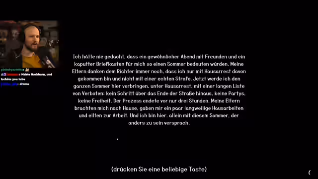 03:13:56Im Spiel ersetzen Aufgaben wie das Aufräumen von Dosen und das Kochen einer Pizza den Hausarrest. Der Streamer trifft auf den Nachbarn Mr. Rupert, der ihn bittet, Orangen in dessen Keller zu tragen. Dabei deutet Rupert an, dass er in seiner Jugend 'Mädchen im Keller hatte', und der Streamer findet später Blut und Leichen, was auf einen Mörder hindeutet. Dies führt zu einer Einbruchsszene in Ruperts Haus.