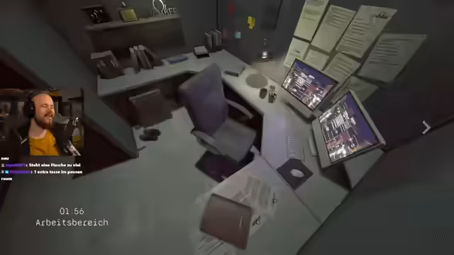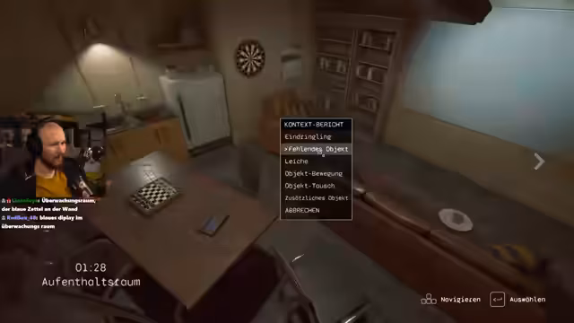 01:11:12Im Spiel entdeckt der Streamer erste Abweichungen, wie vertauschte Tassen und fehlende Petrischalen in der Quarantäne. Er arbeitet eng mit dem Chat zusammen, um Anomalien zu identifizieren, darunter Bewegungen von Objekten wie Schneeschuhen und einem umgedrehten Jet-Ski. Der Streamer testet Systematiken, etwa ob die Reihenfolge von Farbmustern (Weiß-Rot) manipuliert wurde, und bestätigt Verdachtsmomente wie eine fehlende Couchlehne. Trotz Überforderung durch viele Chatter findet er mehrere Anomalien, darunter eine Lichtveränderung im Labor und einen verschobenen Kuchen, was zu erhöhter Spannung führt.