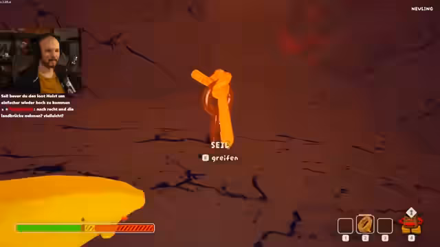 02:56:54Der Streamer spielt ein Jump'n'Run-Spiel in einer gefährlichen Umgebung mit Lava, die konstant gefährlich ist. Er muss vorsichtig klettern und springen, um nicht zu verbrennen. Dabei trifft er Entscheidungen über den Weg und muss auf Ressourcen wie Essen und Verbandsmaterial achten. Er und seine Mitspieler kämpfen gegen die Umwelt und gegen Hunger, um voranzukommen.