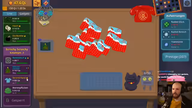 01:47:49Der Streamer hat 'Mundo' erfolgreich freigeschaltet, ein Upgrade, das die Lose automatisch und endlos auswertet, was den Fortschritt beschleunigt. Er testet seine neue Stärke, indem er alle seine Ressourcen in die finalen Upgrades wie 'Rubbelglück' investiert. Das Spiel verläuft nun schneller und automatisierter. Der Streamer scheint das Spiel zu genießen, auch wenn es hohe Verluste verursacht. Er bleibt optimistisch und betont, dass das Vertrauen in den Rubbel-Bot und die Upgrades der Schlüssel zum Erfolg ist, während er das Spielende erreicht und auf eine große Geldsumme hinarbeitet.