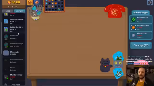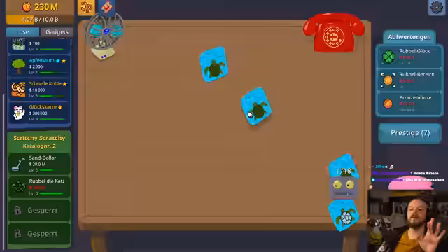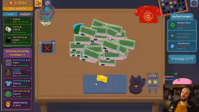 01:22:02Nachdem der Streamer den ersten Katalog freigeschaltet hat, wird er schneller reicher. Er investiert in Upgrades wie Rubbel-Bot Stärke und Rubbelglück, um die Gewinne zu maximieren. Ein Highlight ist der Kauf des 'Ventilators', der das Rubbeln beschleunigt. Der Streamer entdeckt den 'Nachtmarkt', der zwar nur Cosmetics anbietet, aber ein neues Ziel darstellt. Er beginnt auch, 'Glückskatzen' zu kaufen, die riskante Lose mit hoher Gewinn- oder Verlustwahrscheinlichkeit sind, und zeigt, wie er seine Strategie anpasst, um sein Kapital zu maximieren.