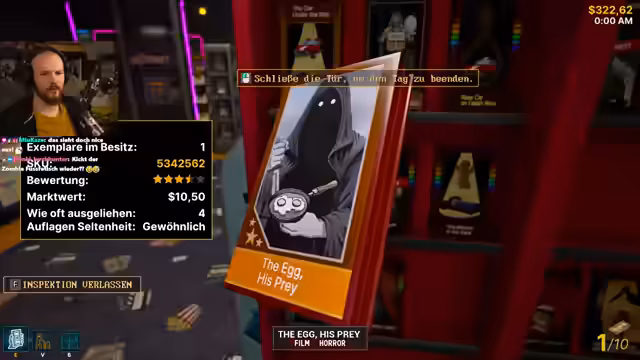 04:34:54Mit der Eröffnung des Ladens beginnt der 'Horrortag', beworben mit einem 'Freitag der 13.'-Angebot. Grace agiert effektiv an der Kasse, während der Streamer Werbung macht und Kunden den Weg in den Laden weist. Horrorausleihe und -verkauf laufen gut an, und die Rückgabe wird stark frequentiert. Trotz des Andrangs bleibt der Betrieb reibungslos, und es werden auch Erotikfilme und andere Genres verkauft.