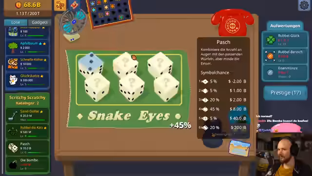 01:39:52Nachdem der Streamer das Upgrade 'Rubgelbereich' freigeschaltet hat, konzentriert er sich darauf, das nächste, extrem teure Upgrade 'Mundo' zu erreichen, das 2 Billionen Dollar kostet. Er beschreibt die Taktik, seine Ersparnisse in die riskanten Glückskatzen zu investieren, um schnell an Geld zu kommen, auch wenn dies zu hohen Verlusten führen kann. Er entdeckt den 'Pasch', eine neue Karte für 10 Billionen Dollar, die eine noch höhere Stufe darstellt. Der Streamer bleibt aber vorerst bei seinem Ziel, 'Mundo' zu kaufen und zu präsentieren.