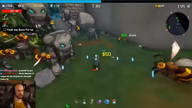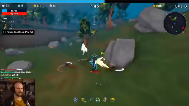 06:28:37Der Streamer konfrontiert verschiedene Bosse und Herausforderungen im Spiel. Er kämpft gegen Bolzenschwein der Schreckliche und später gegen einen größeren Boss. Er findet, dass sein Build zu langsam ist und mehr Schaden braucht. Er nutzt verschiedene Upgrades wie Aura-Schaden und Projektilanzahl, um seine Chancen zu verbessern, aber es ist ein harter Kampf.
