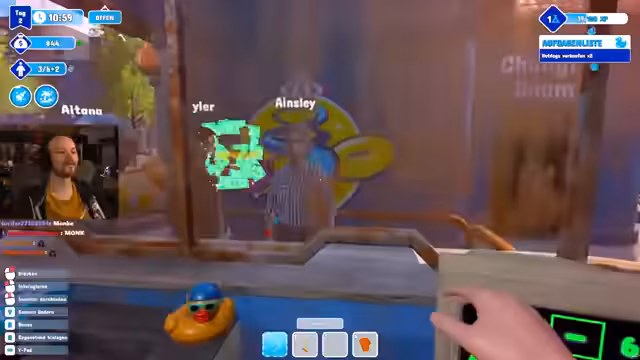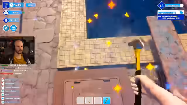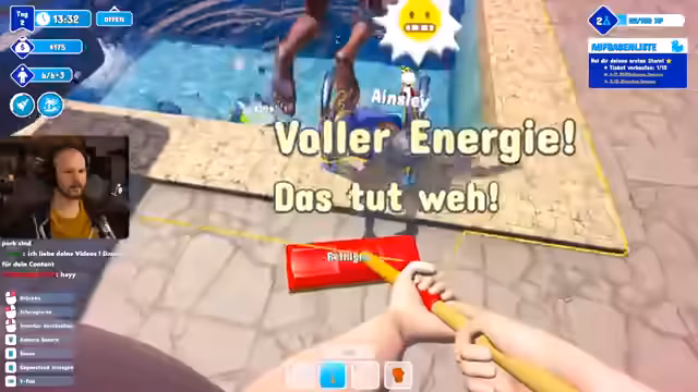03:08:29Der Bau von Liegen wird abgeschlossen, um den Komfort der Besucher zu erhöhen. Ein fehlender Handschuh wird gefunden. Der Wasserpark wird feierlich eröffnet, und die ersten Besucher werden begrüßt, wobei auf korrekte Tickets und Armbänder geachtet wird. Einige Besucher werden aufgrund von Fehlverhalten ermahnt. Es wird auf die Einhaltung der Parkordnung geachtet, indem Müll gesammelt und Hotdogs mit verschiedenen Soßenwünschen verkauft werden. Der Streamer bedankt sich für den Support und verteilt Flyer, um den Park weiter zu bewerben. Es wird auf Sauberkeit geachtet, indem der Park regelmäßig mit einem Mopp gereinigt wird. Der Park erfreut sich großer Beliebtheit, und es wird überlegt, wie der Park weiter verbessert werden kann. Die ersten Besucher äußern sich positiv über den Park, während der Streamer sich um die Sauberkeit und Ordnung kümmert.