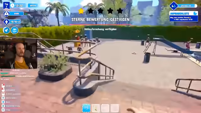 02:50:15Während des laufenden Betriebs muss der Streamer mehrere Herausforderungen meistern. Die Musik ist zu laut und muss leiser gestellt werden. Ein Zuschauer spendet 10 Gifted Subs, worüber sich der Streamer sehr freut. Plötzlich ertrinkt ein Gast namens Jamie im Pool. Der Streamer reagiert schnell und wirft ihm einen Rettungsreifen zu. Er verkauft weiterhin Hotdogs und Tickets und kümmert sich um die Sauberkeit des Parks. Er schließt das Tutorial ab und erhält den Hinweis, seinen ersten Stern zu verdienen. Dafür muss er 15 Tickets verkaufen und eine Dusche bauen. Er baut eine weitere Dusche und testet sie, indem er einen Gast hineinstoßt. Der Streamer verkauft weiterhin Tickets und Flyer und kümmert sich um den Müll. Er stellt fest, dass die Mülleimer stinken und muss sie leeren. Außerdem entdeckt er, dass einige Gäste auf dem Boden schlafen und überlegt, weitere Liegen zu kaufen.