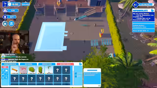 03:18:57Es wird überlegt, die Gehgeschwindigkeit im Park zu erhöhen und neue Attraktionen zu erforschen. Zur Auswahl stehen Wasserpistolen, ein Rettungsringstand, einfache Schwimmbecken, Laufgeschwindigkeit, ein Pinsel, Parkdekoration, ein Limonadenstand, Wartung, einfache Toiletten und größere Taschen. Die Community bevorzugt größere Taschen. Der Streamer entscheidet sich, in die Schönheit des Parks zu investieren, um die Gäste mit zusätzlichem Trinkgeld zu belohnen. Es werden neue Becken freigeschaltet und das alte, heruntergekommene Becken abgerissen, um Platz für ein schickeres Upgrade zu schaffen. Der Platz wird optimal genutzt, und es wird überlegt, weitere Attraktionen hinzuzufügen. Der Streamer dekoriert den Park mit Bänken, Schirmen und Palmen, um eine angenehme Atmosphäre zu schaffen. Es werden zusätzliche Toiletten aufgestellt, um den Komfort der Besucher zu erhöhen. Der Streamer achtet auf Symmetrie und Ordnung im Park und platziert Mülleimer strategisch, um Sauberkeit zu gewährleisten.
