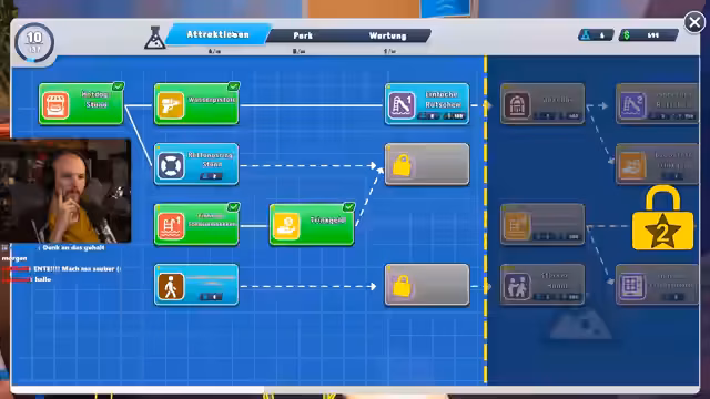 03:24:49Nachdem der Park auf Vordermann gebracht wurde, konzentriert man sich auf die Forschung neuer Features wie Wasserpistolen und Schwimmbecken. Die Community wünscht sich vor allem größere Taschen und Dekorationen, um den Park attraktiver zu gestalten. Der Streamer investiert in die Schönheit des Parks, um mehr Gäste anzulocken und das Trinkgeld zu erhöhen. Es werden neue Schwimmbecken freigeschaltet und das alte Becken durch ein moderneres ersetzt. Der Park wird mit Bänken, Schirmen und Palmen dekoriert, um eine angenehme Atmosphäre zu schaffen. Es wird überlegt, Personal einzustellen, um die Arbeitslast zu reduzieren. Ein Hausmeister soll sich um die Reinigung und Reparatur kümmern, während ein Kassierer den Ticketverkauf übernimmt. Die Kosten für das Personal werden jedoch als hoch angesehen. Es werden Ticketpreise erhöht, um mehr Einnahmen zu generieren. Der Streamer experimentiert mit dem Pinsel, um den Park farblich zu gestalten und eine Holzoptik zu erzeugen. Es wird überlegt, die Wände kackbraun zu streichen, um Verschmutzungen weniger sichtbar zu machen.