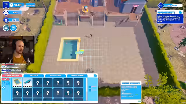 02:21:43Der Streamer öffnet das Baumenü und wählt ein rostiges Schwimmbecken aus, das zum heruntergekommenen Zustand des Parks passt. Er platziert das Becken in der Mitte des Geländes, um später noch Platz für andere Attraktionen zu haben. Mit einem Hammer wird das Becken aus dem Boden gestampft. Anschließend sucht er den Wasserstamm, um das Becken zu befüllen. Zusätzlich platziert er ein rostiges Sprungbrett neben dem Becken, um den Gästen mehr Abwechslung zu bieten. Er überlegt, das Sprungbrett an der langen Seite des Beckens zu platzieren, entscheidet sich aber aus optischen Gründen für die kurze Seite. Nach Abschluss der Vorbereitungen öffnet er den Park und beginnt mit dem Ticketverkauf. Er verkauft Tickets für verschiedene Altersgruppen und Zeiträume und weist die Gäste auf die Rutschgefahr hin. Außerdem kümmert er sich um die Beseitigung von Pfützen, um Unfälle zu vermeiden.