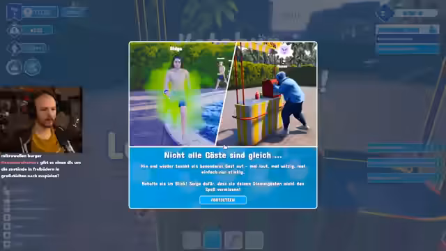 02:55:58Der Streamer verkauft weiterhin Tickets und Hotdogs und verteilt Flyer. Plötzlich ertrinkt ein Gast namens Cassius im Pool. Der Streamer eilt zur Rettung und kann Cassius retten. Er stellt fest, dass die Mülleimer stinken und geleert werden müssen. Außerdem sind die Liegen nicht ausreichend genutzt und die Gäste schlafen auf dem Boden. Ein Gast möchte einen Hotdog mit Ketchup. Der Streamer fragt die Zuschauer, ob sie Hotdog mit Ketchup oder Senf bevorzugen. Er muss die Rutsche sauber machen und wird auf einen Pool aufmerksam, der 'out of order' ist. Er entdeckt, dass der Stöpsel fehlt und repariert den Pool mit einem Hammer. Am Ende des Tages zieht der Streamer Bilanz: Er hat einen halben Stern erreicht, aber die Zufriedenheit der Gäste ist gering. Es gab Verletzte und Ekel. Er beschließt, den Tag zu beenden und sich auszuruhen.