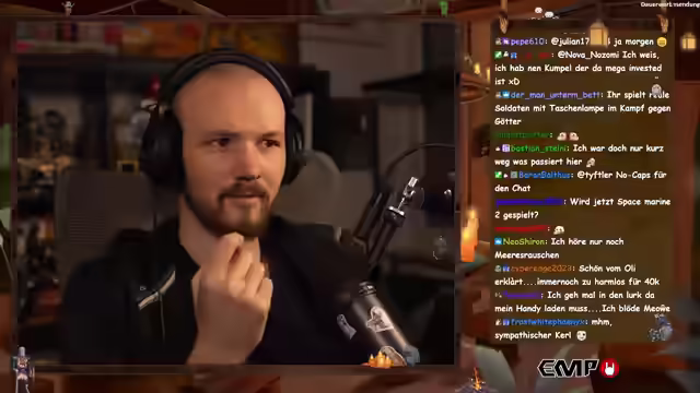 01:18:12Ein Spieler hat ein bisschen geupgradet und kommentiert ein Tattoo im Love Island-Stil. Die Gruppe diskutiert über die Frage, ob Sex böse ist im Kontext des Spiels. Die Spieler erhalten Äxte und bewundern die vom Imperator gesegnete Waffe eines Mitspielers. Die Gruppe bereitet sich auf den nächsten Abschnitt vor und ein Spieler geht als "Vorkostar-Tester-mäßig" voran. Es wird festgestellt, dass die Axt langsam schlägt, aber viel Schaden verursacht. Die Gruppe entdeckt, dass Schwerverangsthoff mit der Axt sehr effektiv gegen Gegnergruppen ist. Ein Spieler springt vor einem dicken Gegner herunter, um ihm zu entkommen. Die Gruppe teilt sich auf, wobei ein Spieler lootet, während die anderen kämpfen. Die komischen Köpfe der Gegner werden auf den Einfluss von Nurgle zurückgeführt. Ein Spieler findet die Möglichkeit, Köpfe mit Nahkampfangriffen abzuhacken, sehr befriedigend. Es kommt zu einem Unfall mit einer Granate. Ein Spieler kommentiert, dass er mit der Maschinenpistole nicht mehr so gut zielen kann. Die Gruppe scherzt über die Möglichkeit, als eSport-Team oder Boygroup aufzutreten. Ein Spieler nimmt versehentlich Munition auf, obwohl er bereits voll war. Ein Spieler wird von einem Flammenwerfer überrascht und gerettet. Die Gruppe findet eine Heilungsstation und diskutiert über eine Taschenlampe. Ein Spieler erzählt von einem Tierarztbesuch mit Sammy. Die Gruppe findet eine leere Kiste und vermutet, dass sie dem Balancing dient. Die Gruppe muss einen Weg nach unten finden, da alles explodiert.
