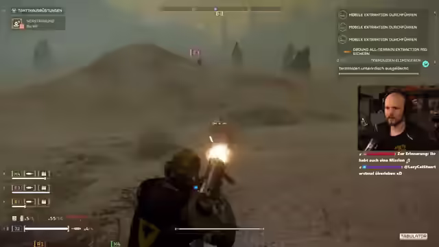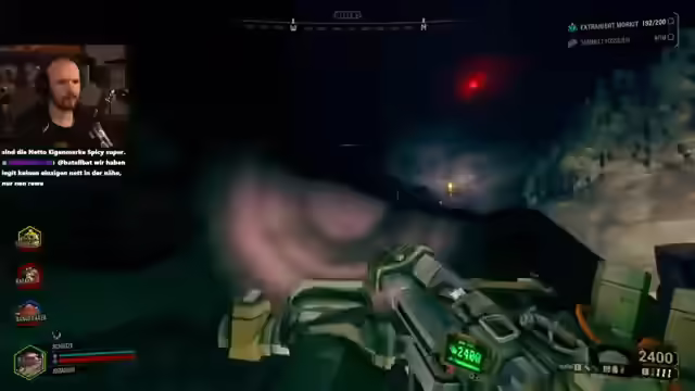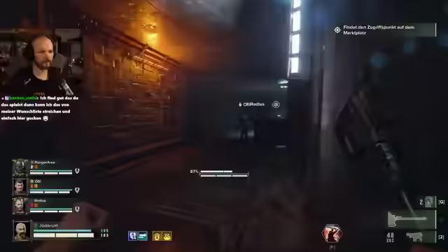00:46:17Die Gruppe erreicht einen Sicherheitscheckpoint und einen Aufzug. Der Streamer fühlt sich wie in einer Mikrowelle eingesperrt. Er hätte gerne eine Sniperwaffe. Er findet einen Datensammler und muss beschützt werden. Er ist down und es gibt viele Gegner. Er muss ein Minispiel machen, um wiederbelebt zu werden. Er wird von Granaten getroffen und muss sich schützen lassen. Er fragt, ob die Granaten Schaden anrichten. Er vergleicht das Spiel mit Tomaten-Gurken schneiden in der Küche. Er fragt nach Munition und kommentiert Ollis Vorgehensweise. Sie erreichen ein Ziel und werden von einer Gatling Gun beschossen. Der Streamer stirbt und wird wiederbelebt. Er kommentiert die lila Balken, die ihre maximale HP mindern. Er findet Munition und ein Aufputschmittel. Er vergleicht die Umgebung mit dem Frankfurter Hauptbahnhof. Er findet eine Spritze und fragt, was sie bewirkt. Er wird von Ranger mit einer Spritze behandelt, die Pheromone enthält. Er findet Munition und eine Heilungs-Dings.