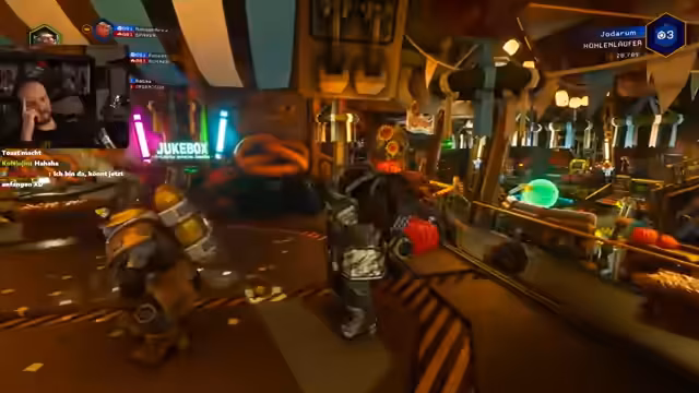 01:51:50Die Gruppe erkundet die detaillierte Lobby des Spiels, die im Oktoberfest-Theme gestaltet ist. Der Streamer stellt verschiedene Getränke und Interaktionsmöglichkeiten vor, bevor sie eine Mission auf 'extrem' Schwierigkeit starten. Die Spieler verteilen sich auf verschiedene Klassen und Rollen, wobei der Streamer als 'Buddler' fungiert. Sie starten in den Kristallhöhlen und müssen sich orientieren und gegen die ersten Gegner positionieren.