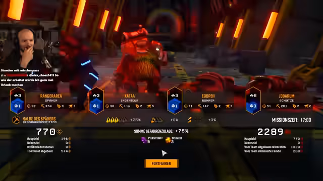 03:11:09Das Team schafft es, alle Ressourcen zu sammeln und die Mission erfolgreich abzuschließen. Die Transportkapsel wird gerufen und das Team entkommt gerade rechtzeitig. Der Streamer freut sich über den Erfolg, besonders da einige gefährliche Situationen knapp überstanden wurden. Die Metaprogression ist nun verbessert, was das Team für zukünftige Missionen stärker macht. Es werden Pläne für die nächste Mission besprochen, möglicherweise mit einem höheren Schwierigkeitsgrad.