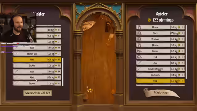 01:46:55Nach dem Turnier wird das verdiente Gold für Verbesserungen ausgegeben. Es wird eine bessere Rüstung, ein Gambison, erworben und wichtige Ausrüstungsgegenstände wie die Flail versichert, um sie bei einem Todesfall nicht zu verlieren. Der Streamer erkundet die Optionen der Waffenschmiede und optimiert seine Ausrüstung für die kommenden Kämpfe.