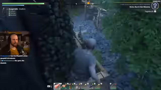 04:02:08Der Streamer kehrt ins Miasma zurück, um seine Mission fortzusetzen. Er kämpft gegen Sumpfkröten und andere Gegner, wobei er feststellt, dass sein Zauberstab ohne Munition nutzlos ist. Er lernt, dass er Feuerbälle aus Harz craften kann, aber da es zu regnen beginnt, beschließt er, die Nacht durchzuschlafen. Nach einer erholsamen Nacht kehrt er gestärkt zurück und entdeckt, dass er mit seinem Zauberstab effektiver kämpfen kann. Er erreicht die Questposition und findet einen Elixierbrunnen, der seine Zeit im Miasma wieder auffüllt. Er entdeckt Spawner, die er zerstören kann, um die Gegner zu eliminieren und Loot zu sammeln. Er kämpft sich durch weitere Gegner und entdeckt eine tiefere Ebene, die auf einen Bosskampf hindeutet. Er ist gespannt, was ihn dort erwartet und sammelt weitere legendäre Runen und ein Bronzeschwert.
