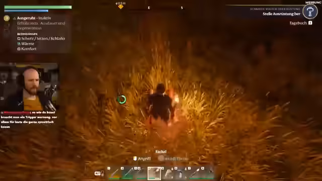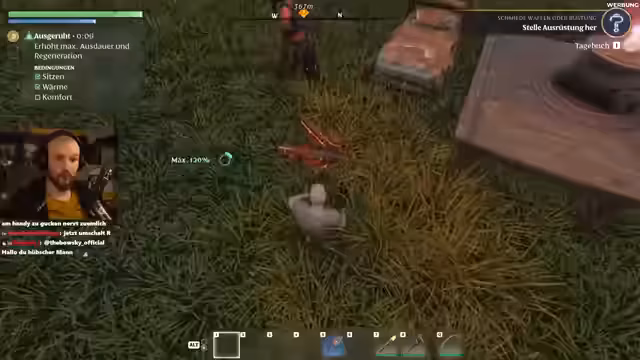 02:26:11Im Laufe seiner Erkundung entdeckt der Streamer einen Holzunterschlupf mit einer Fackel und einem Lagerfeuer. Er lernt, dass er am Lagerfeuer Essen kochen kann und dass das Sitzen in der Nähe einen Komfort-Buff verleiht, der die Regeneration verbessert. Er kocht Fleisch, um seine Gesundheit zu maximieren und den Komfort-Buff zu erhalten. Das Spiel bietet viele Mechaniken, die ihn während des Streams überfordern, aber er versucht, sich zurechtzufinden. Er entdeckt, dass er mit 'Alt' durch sein Inventar scrollen kann. Innerhalb des Miasmas bemerkt er, dass die Zeit herunterläuft, was ihn dazu zwingt, schnell zu handeln oder das Gebiet zu verlassen, um die Zeit zurückzusetzen. Er findet einen Siegelring des Wächters, der Lebenspunkte und Gesundheitsregeneration verbessert, und eine Sanduhrkapsel, die seine verbleibende Zeit im Miasma wiederherstellt.