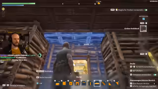 03:21:20Der Streamer beginnt mit dem Bau seines ersten Hauses, wobei er das Bausystem des Spiels erkundet. Er experimentiert mit verschiedenen Bauelementen und Funktionen, wie dem First-Person-Modus im Baumodus und der Rückgängig-Funktion (Z-Taste), die er als sehr nützlich empfindet. Er plant ein leicht erhöhtes Haus mit einer kleinen Veranda und versucht, die Werkbank und Kisten umzustellen, was jedoch nur nach dem Leeren der Kisten möglich ist. Nach dem Sammeln von mehr Holz, um sein Fundament zu erweitern und eine Treppe zu bauen, stellt er fest, dass er Dachblöcke an der Werkbank herstellen muss. Er freut sich über den Fortschritt seines kleinen Hauses und die Möglichkeiten, die das Bausystem bietet, obwohl er es noch als etwas fummelig empfindet. Er zieht Wände hoch, plant Fenster und eine Tür, um sein Zuhause fertigzustellen, bevor er sich auf weitere Erkundungen begibt.