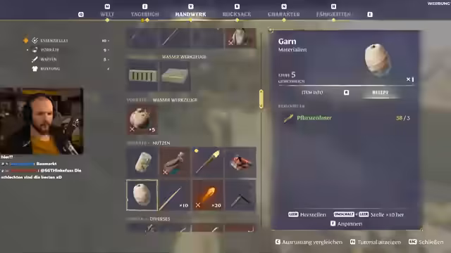 03:37:42Nachdem das Haus fast fertiggestellt ist, konzentriert sich der Streamer auf das Herstellen besserer Ausrüstung. Er stellt fest, dass er Stoff und Garn benötigt, die sich in seiner Truhe befinden. Er craftet eine dicke Rüstung, Handschuhe und ein Kochset. Oswald gibt ihm weitere Quests, darunter das Retten von Blutal und das Beseitigen der Wurzel des Elends, wofür er einen Gleiter herstellen soll. Er sammelt Pflanzenfasern, um den Gleiter und den Rest seiner Ausrüstung zu craften, darunter einen Hut, Schuhe und eine Hose. Er bewundert seine neue Ausrüstung und plant, einen winzigen Rucksack zu craften, um mehr Inventarplatz zu haben. Er möchte auch die Angel ausprobieren und räumt sein Inventar auf, bevor er sich auf den Weg macht. Er überlegt, ob er den Gleiter unterwegs herstellen kann, stellt aber fest, dass er dafür zur Werkbank zurückkehren muss.