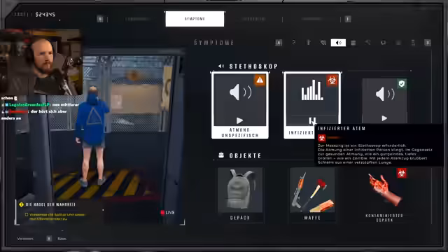 03:46:03Der Streamer nimmt eine Mission zur Eliminierung von Molotow-Cocktails an, die gestohlen wurden und einen Konvoi in Brand gesetzt haben. Es werden aggressive Personen identifiziert, die Angriffe auf Inspektoren zeigen, und zur Quarantäne oder Liquidierung entschieden. Neue Symptome wie 'Aggression' werden entdeckt und im System festgehalten. Der Streamer testet Symptome mit Spritzen und Scanner, um infizierte Personen zu isolieren. Viewer-Interaktionen werden ignoriert, wie vorgegeben. Die Entscheidungen hängen von Symptomen wie roter Haut, Schmerzen oder ungewöhnlichem Verhalten ab.