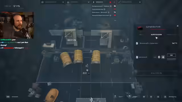 03:17:56Nach dem Ende der Überprüfungsrunde des Tages wird das Lager aufgeräumt. Es folgt ein Fokus auf den Ausbau der Infrastruktur: Sanitärkästen werden aufgestockt, eine Notfallbatterie für mögliche Stromausfälle angeschafft und ein Verteidigungsturm an der Mauer gebaut. Der Streamer hat genügend Energie und Kapazitäten, um diese Upgrades durchzuführen. Ein kurzer Angriff wird mit den vorhandenen Soldaten und Fässern abgewehrt, was die Verteidigungsstrategie bestätigt. Die Notwendigkeit, den Generator auszubauen, wird für die Zukunft erwogen.