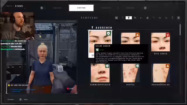 03:26:36Der Stream startet mit der ersten Inspektion des Tages, bei der eine Person mittels Scanner, Reflextests und Temperaturmessung überprüft wird. Es werden Symptome wie blutige Augen, möglicher Rauchverdacht und ein neues Symptom 'Blut im Mund' identifiziert. Aggression wird als weiteres Symptom entdeckt, das zur Quarantäne führt. Der Streamer vergleicht Herkünfte der Personen und entscheidet über Einlass in die Überlebensstadt oder Quarantäne. Dabei werden technische Geräte wie Taschenlampen und Scanner eingesetzt, um versteckte Symptome aufzudecken. Die Inspektionen sind präzise und chronologisch aufgebaut, wobei jeder Fall unabhängig bewertet wird.