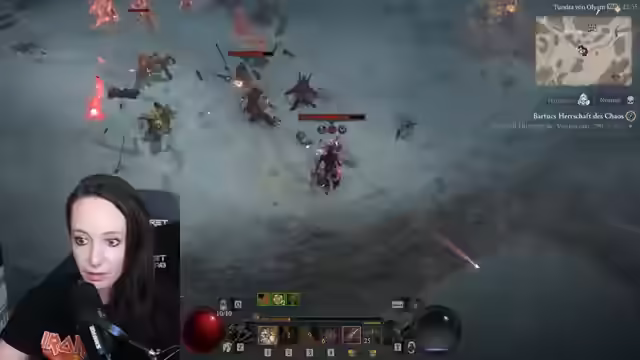 06:01:09Die Streamerin setzt sich das Ziel, Level 15 zu erreichen und erkundet die neuen Inhalte der Season. Dabei äußert sie sich begeistert über die Grafik und die düstere Stimmung von Diablo 4. Es kommt zu einer unerwarteten und stressigen Situation im Spiel, die jedoch glimpflich verläuft. Erleichtert überstandene Situationen werden mit Humor kommentiert. Die Streamerin nimmt Loot auf und sucht nach einem Händler, um Gegenstände zu verkaufen. Sie entdeckt den Flüsterbaum und legt Fokus in die Kiste. Um nicht zu sterben, werden Nebenquests erledigt und das Level erhöht. Die Season-Kampagne wird als entspannter und punktreicher beschrieben. Die Community teilt ihre Level-Fortschritte im Chat. Die Streamerin findet einen Söldner, den sie aber erst später nutzen kann und spricht über die Legion-Events. Es wird kurz über das Spiritborn DLC gesprochen und Anekdoten aus der Serie Walking Dead erzählt, um die überraschenden Gegnermassen im Spiel zu vergleichen. Abschließend äußert sie ihre Angst vor dem Butcher und erzählt von früheren Fluchtversuchen vor diesem Gegner.