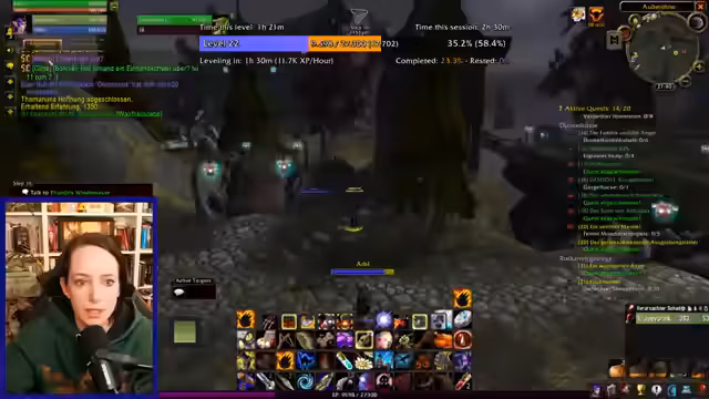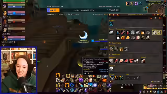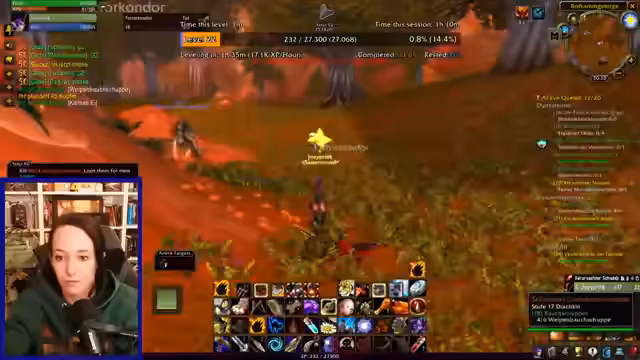 01:30:27Der Streamer berichtet von seinen persönlichen Erfahrungen beim Zuschauen des Sauerkraut-Events. Er findet es faszinierend und lustig, die Dramen und Todesfälle innerhalb der deutschen Streamer-Szene zu verfolgen, die er vorher kaum kannte. Anschließend beginnt er selbst mit seinem Nachtelfen im Spiel, kämpft aber mit der unübersichtlichen Benutzeroberfläche und dem Addon-System. Nach anfänglichen Verwirrungen und Problemen mit den Addons beginnt er langsam zu leveln, ist aber unsicher über seine eigene Überlebensfähigkeit im Hardcore-Modus.