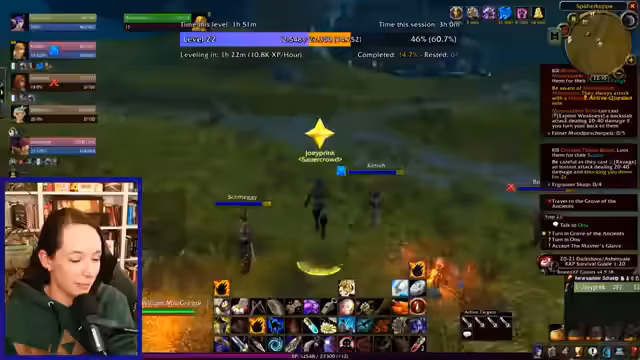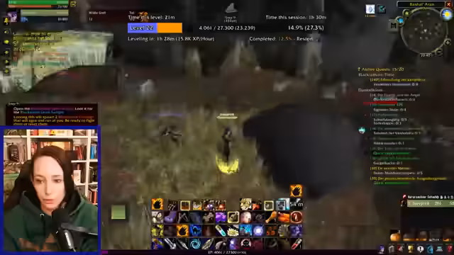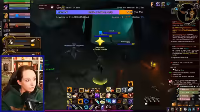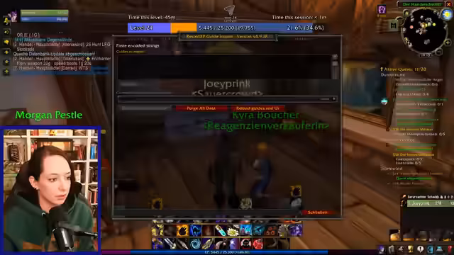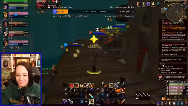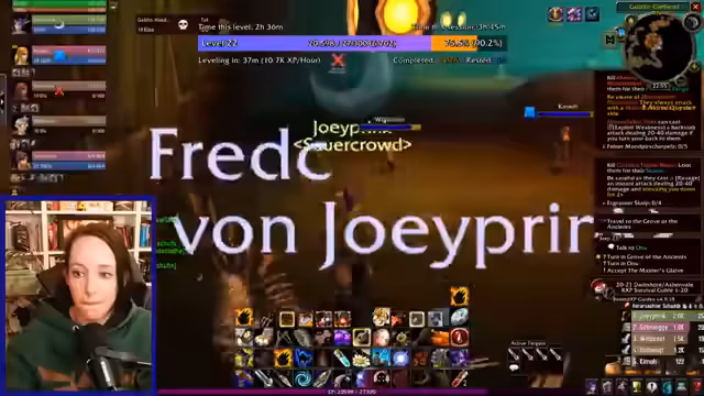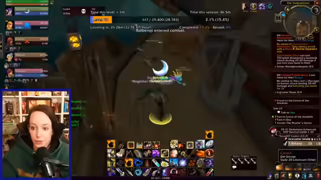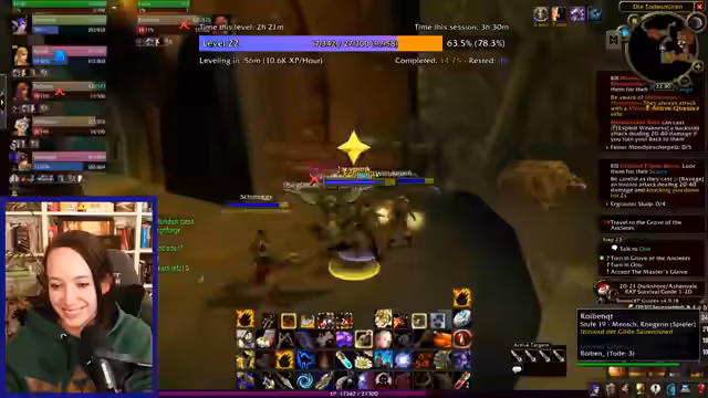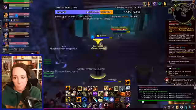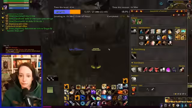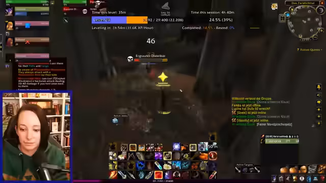 01:45:51Der Streamer spielt nun aktiv World of Warcraft Classic. Er navigiert sich durch die Anfangsgebiete, akzeptiert Questen und kämpft gegen niedrig-levelige Gegner wie Welpen und Gnolle. Das Leveln gestaltet sich als mühsam, und er muss vorsichtig agieren, um nicht einem Untergang durch einen Angriff von mehreren Gegnern zu erliegen. Er experimentiert mit Taktiken wie dem Setzen von Fallen, findet aber heraus, dass das allein Angreifen ganzer Camps für seinen Spielstil zu stressig ist. Er konzentriert sich auf das Erledigen einzelner, leichterer Gegner.