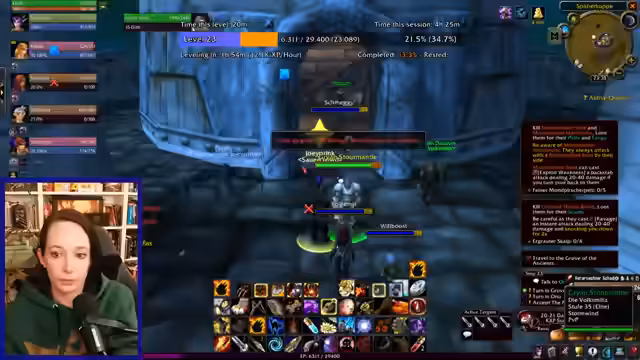 05:59:32Nach dem erfolgreichen Kampf beginnt der Ausstieg aus dem Dungeon. Dabei kommt es zu einem unglücklichen Zwischenfall, bei dem das Haustier 'Fred' stirbt, was eine Diskussion über den Pet-Tod in WoW Classic auslöst. Die Gruppe gibt die Hauptquests ab, während eine Nebenquest durch einen nicht aktivierten Inventargegenstand blockiert ist und man sich über die Notwendigkeit der manuellen Aktivierung solcher Gegenstände im Inventar unterhält.
