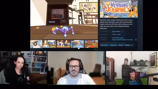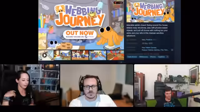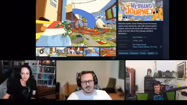 00:13:36Der Stream beginnt mit technischen Startschwierigkeiten, die aber schnell gelöst werden. Die Moderatoren begrüßen ihre Gäste Sebastian Uitz von Firetotem Games und ihren Kollegen Thomas. Der Hauptgast Sebastian stellt sich als Gründer des Indie-Studios vor und kündigt an, über das knapp vier Jahre entwickelte Spiel "A Webbing Journey" zu sprechen, das vor zwei Wochen erschienen ist. Das Spiel, in dem man eine Spinne steuert, wird als cozier, kreativer Sandbox-Titel mit Puzzle-Elementen in 3D-Welten wie Küche, Büro und Kinderzimmer vorgestellt.
