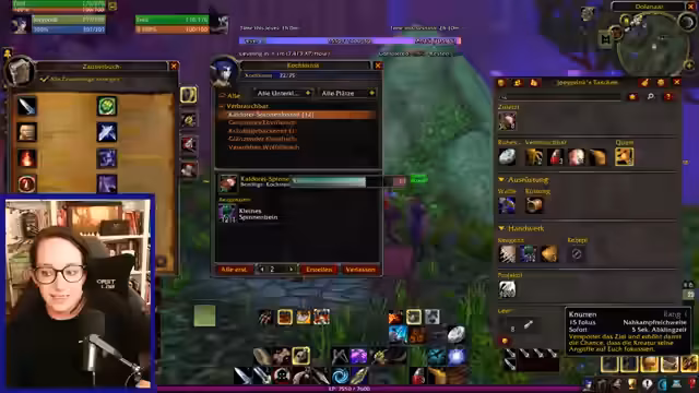 03:36:32Die Gruppe kehrt zur Quest-Gegend 'Weberhausen' zurück, um das letzte benötigte Spinnenbein für eine Kochquest zu farmen. Die Gegend wird als unangenehm und voller Gegner beschrieben, die nicht immer ignoriert werden können. Das anhaltende Problem des vollen Inventars behindert das Farmen erheblich, da wertlose Gegenstände wie ein leerer Tuchmacher erst verkauft werden müssen, bevor Platz für neue Questitems geschaffen wird.