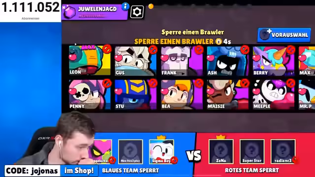 01:55:53Der Streamer erzielt einen Nice Kill, da der Gegner ein bisschen lost war. Er campt im Busch und macht mit seiner Ulti Druck. Er wartet mit dem Einsatz von Hypercharge und erzielt mit Ash ein 11 zu 0. Nach dieser Runde bemerkt er, dass der Kanal gerade die 1.111.111 Abos erreicht hat und bedankt sich für den Support. Er spielt weiter Hotzone mit Duellkäfer und will in Mythisch 1 rein. Er überlegt, wieder Juju zu spielen und Barry wegzubannen. Er stellt fest, dass die Gegner Barry gebannt haben, was ihn freut, da Juju offen ist. Er wählt Penny, mit der sie bisher souverän gewonnen haben. Wenn sie jetzt gewinnen, wären sie relativ nah bei Diamond 3.