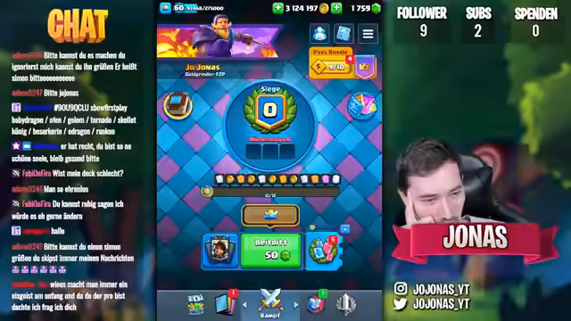 00:02:20Der Stream beginnt mit technischen Schwierigkeiten; der Streamer ist zunächst nicht hörbar und muss die Soundeinstellungen überprüfen. Er bittet die Zuschauer, ihre Clan-Kürzel und Spielernamen sowie die Namen ihrer Decks in den Chat zu schreiben, damit er deren Decks aus den Profilen kopieren kann. Ziel des Streams ist es, die neue Season zu starten und das Ziel von 15.000 Trophäen zu erreichen, um letztendlich den Titel Ultimate Champion zu ergattern.
