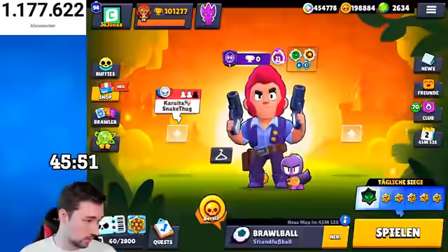 00:00:00Nachdem der Streamer mit technischen Problemen zu kämpfen hatte und komplett ausgefallen war, konnte er nach kurzer Zeit wieder live gehen. Der Stream begann mit dem Ziel, den Brawler GG auf Prestige 100 zu pushen, wobei er zunächst nach passenden Teammates für das Spiel Brawl Ball suchte. Um den Prestige-Ziel von 100 zu erreichen, war ein Team mit niedrigerer Elo notwendig, um eine Siegesserie aufzubauen und Trophäen zu sammeln. Der Streamer erwähnte zudem ein wichtiges Programm für den Tag, welches ein Geschenk um 10 Uhr und ein gemeinsames Streamen mit seiner Freundin ab 11 Uhr umfasste.