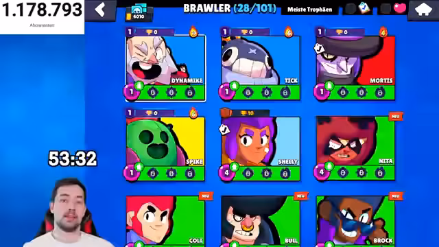 00:00:00Der Stream beginnt mit Brawl Stars auf dem Power-1-Account. Der Streamer erklärt, dass er den Stream nur alle 15 Minuten starten kann, was zu leichten Verzögerungen führen kann. Als Ziel für den Stream wird genannt, Prestige mit dem Brawler Leon zu erreichen und das tägliche Geschenk im Shop um 10 Uhr abzuholen. Der Plan für den Stream wird vorgestellt, welcher das Klonen von Brawlern, das Farmen von Quests und das Öffnen der Omega-Box umfasst.