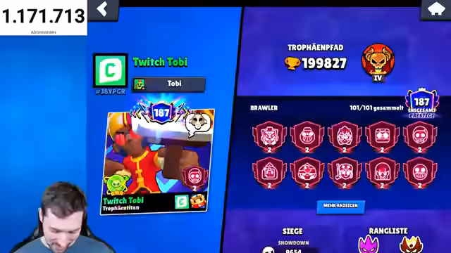 00:00:00Der Streamer startet einen ambitionierten Versuch, als erster Deutscher die 200.000 Trophäen-Marke im Spiel Brawl Stars zu erreichen. Die Erreichung der 199.827 Trophäen steht bereits kurz bevor und dient als Ausgangspunkt. Zusammen mit einem Duo-Partner namens Tobi wird ein Duo-Showdown-Modus zur Zielerreichung geplant, um so schnell wie möglich Trophäen sammeln zu können.